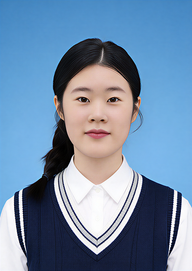 保留第一张图人物脸型、发型、年龄特征生成标准纯正面证件照;纯正面,人物居中(居中构图),位于画面中心,为视觉聚焦点,入境范围头部至胸部下方10cm以上区域,外穿深蓝色学院风针织背心,内搭白色翻领长袖衬衫,背心领口有白色和浅灰色条纹装饰,头肩比例合理,精致清透裸妆+唇色自然,淡妆冷调白皙;肤色嫩白通透;参考第二张图的人物占位和比例,50MM标准焦段,人物占画面80%,头顶至画面上边缘3%,头部发型完整,平视视角(镜头与人物视线齐平)眼神直视镜头;颈肩结构合理,姿态自然放松(左右预留环境空间)纯正面;去除一切饰品;光线均匀柔和,画质清晰,眼神灵动,澄澈,表情自然,头部完整,均匀肤色提亮肤色,修饰脸型,肤质哑光细腻,原生细腻肤质,轻透裸肌感,32K画质,去除人物之外的所有元素,零噪点降噪,简约蓝色纯色背景;严格按照第一张图的内容生成详情