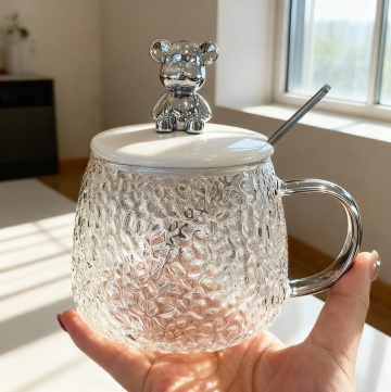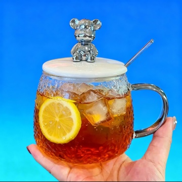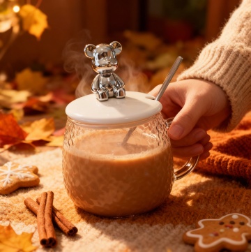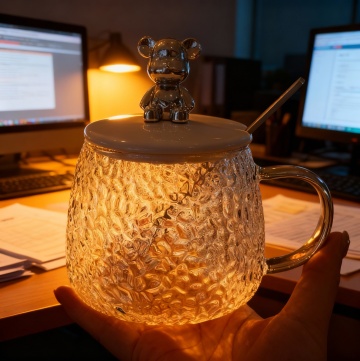 帮我生成5张网红爆款小熊马克玻璃水杯电商主图,画面分别表现有加班熬夜 秋冬季节 冷泡 还需要加上这个产品的主图
