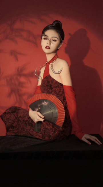 23 岁,钻石脸,狐狸眼凌厉,高鼻梁,哑光红棕唇,黑色高颅顶盘发,戴城堡发箍,穿墨绿色丝绒短裙,坐在摩天轮最高点,手托着下巴看日落,手里的气球在风中摇晃,晚霞映红脸颊,高级氛围感