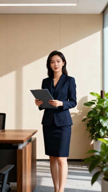 明亮的现代办公室环境,柔和的自然光透过大面积玻璃窗洒入室内,温暖的木质办公桌,桌上放着笔记本电脑、打开的笔记本、蓝色马克杯和一支铅笔,穿着米色开衫与白色衬衫的女性正在专注地使用笔记本电脑,背景有白色书写板、木质书架和简约办公家具,整体风格简约、专业、温馨,具有清晰的空间层次感和舒适的工作氛围,高清晰度,写实摄影风格,柔和光线,自然色彩。