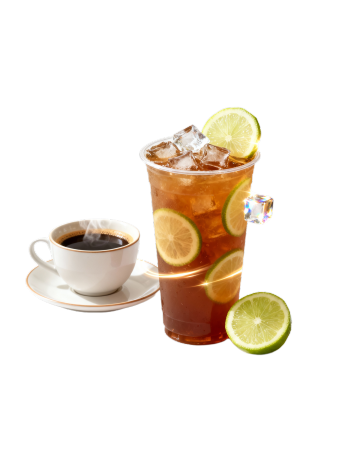 帮我制作一个图片,主题是:现磨咖啡☕️,手打柠檬茶,要有产品同时还要展示卖点,画面高级吸引人 突出主题 字体也许吸引人高级 ,文字大些,图案小些