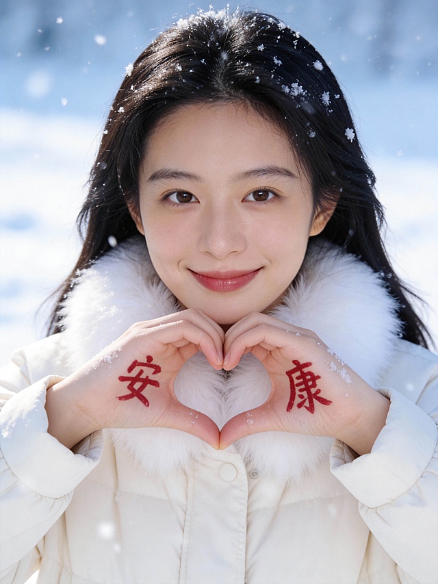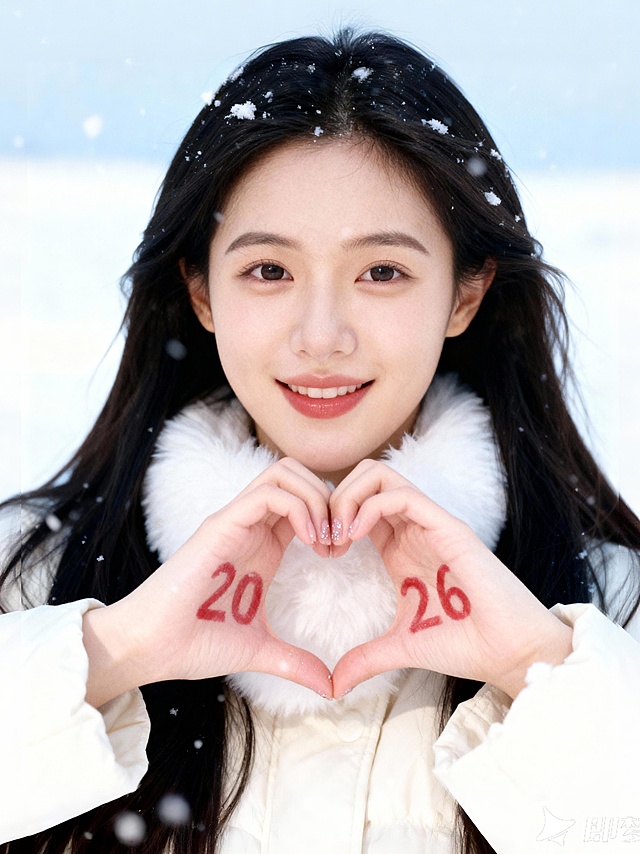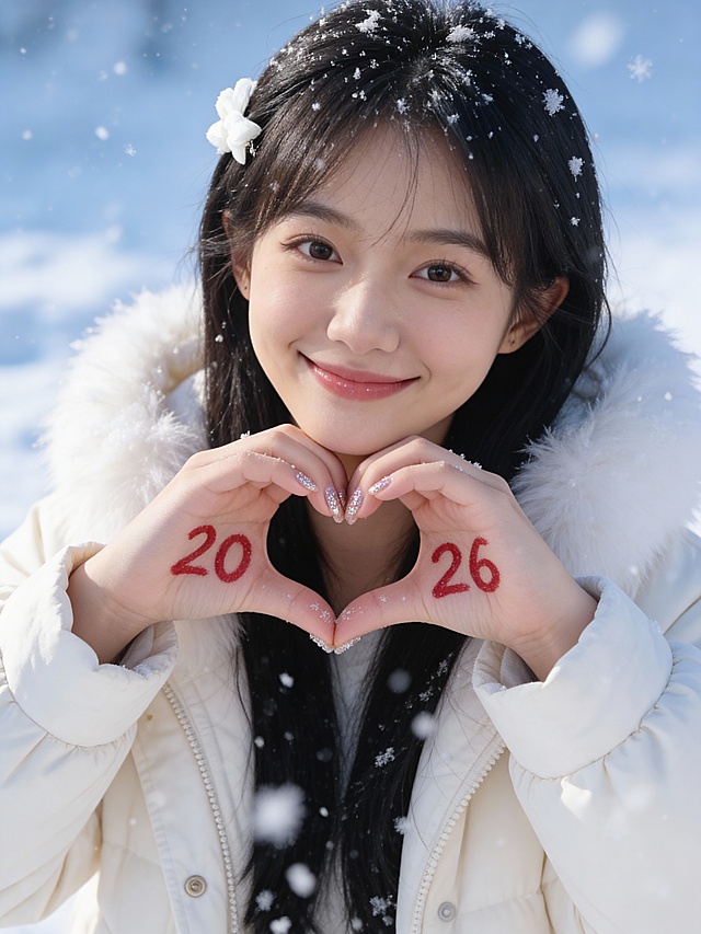 雪中少女双手比心,手写“2026”字样,胶片风滤镜加持,梦幻唯美,清新柔和,实景感十足,手账风点缀冬日浪漫。