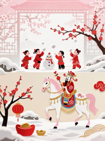 主体是粉白骏马(装饰红蓝祥云纹、赤金流苏配饰,点缀金箔质感),双前蹄腾空踏浅金祥云,后蹄蹬立,仰头咬着一个大红 “福” 字,神态昂扬灵动;周围环绕金竹剪纸、圆元宝剪纸、方福袋剪纸,场景为简约中式门庭(朱红门、金纹横批);背景为红金渐变纹理(带祥云暗纹),配色浓烈明快(粉白、正红、宝蓝、鎏金、浅灰);纯扁平剪纸风格,线条利落干净,新年喜庆氛围饱满
