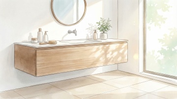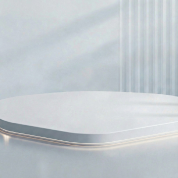夏日背景的极简风格插画,大面积留白,以清新的浅蓝色网格泳池水面为主体,搭配粉色与白色相间的救生圈、黄色救生圈、黄色浮球和绿色棕榈叶,物体边缘有白色高光和简洁阴影,整体色调清爽明快,构图简洁大方,营造出轻松惬意的夏日氛围,无文字信息。