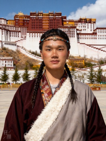 东亚风写实肖像,融合民族与古典元素,服饰细节凸显面料质感,布达拉宫背景赋予神圣庄严氛围。