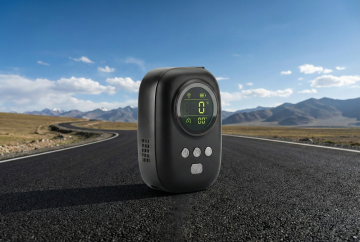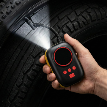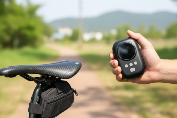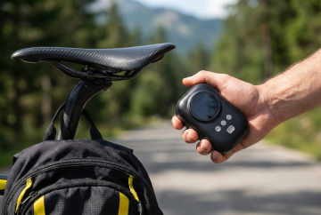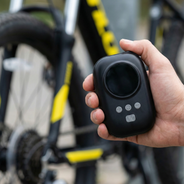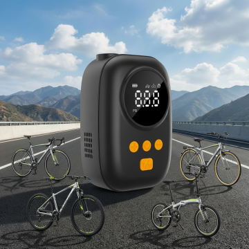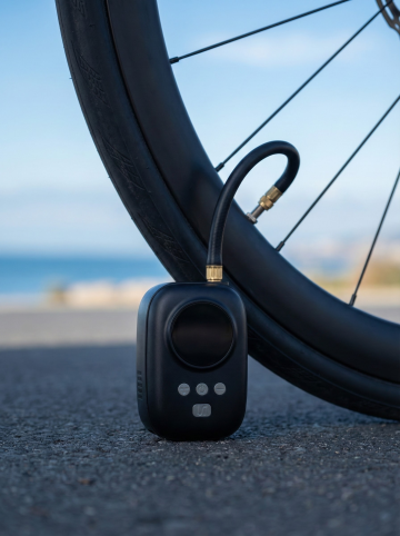 专业产品展示摄影风格,画面中央偏右下角处成年人手握着黑色塑料材质便携式电动打气泵,左侧黑色公路自行车座椅,碳纤维材质纹理质感,下方黑色金属支架和支架包,模糊户外沥青背景,自然光线照明,柔和阴影,三分法则构图,黑色黄色主色调,高清晰度渲染,细节丰富质感真实,现代科技产品与户外运动结合专业氛围。