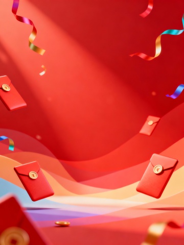 元旦节庆背景,底色以红色为主且有色彩层次,有3D红包和彩带分散在画面周围。