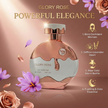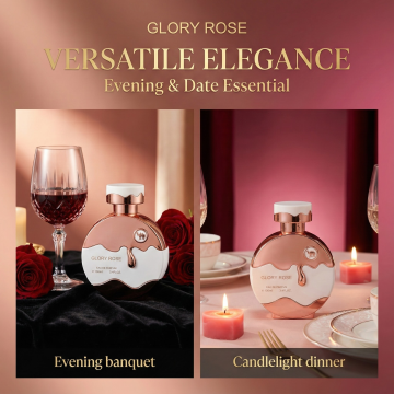 为这款100ml女士香水,生成5张宣传海报,含人像展示图,卖点集合图(卖点列表展示),场景使用图,香调图,调性图,图片尺寸比例1:1,高级调性,符合欧美审美,海报上的文案是英文,不能有中文,贴合产品卖点,卖点参考以下:1. 客群卖点 精准适配“非小清新”风格女性——适合偏爱个性香调、渴望在场合中展现强大气场的成熟女性,或是想在约会/夜晚场景里用独特香气突围的魅力女性。 2. 香味卖点 层次鲜明的“张力型香调” - 前调:藏红花+柠檬,浓郁张力碰撞清新跳脱,瞬间抓住注意力; - 中调:玫瑰糅合薰衣草,浪漫中带清冷质感,平衡尖锐感; - 后调:广藿香+香草+琥珀,醇厚绵长、留香持久,穿透力拉满又不失女性柔韵。 3. 外观卖点 高辨识度的轻奢瓶身 - 玫瑰金与奶白撞色+流动液态设计,自带高级氛围; - 瓶身专属骆驼标识强化记忆点; - 100ml大容量,兼顾实用度与陈列颜值。 4. 调性卖点 “大胆女性化”的专属气场 打破温柔香的刻板印象,既有穿透力的强势张力,又包裹着细腻的女性柔感,是个性与魅力兼具的“气场型香氛”。 5. 适用场景卖点 氛围感场合的加分利器 适配秋冬季节的醇厚香气,是夜晚约会的“氛围催化剂”,也是晚宴、派对等需要凸显强大气场场合的香氛首选。