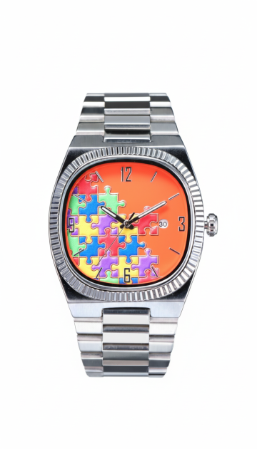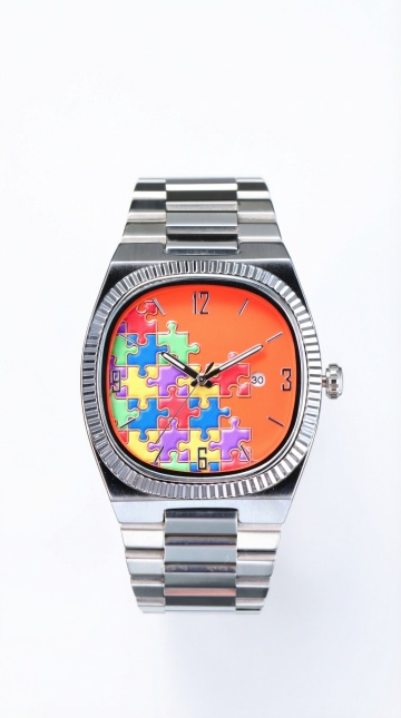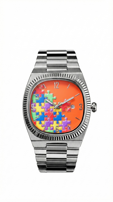 奢华感与优雅感交织,金属风表壳搭配皮质风表带,重拟物风礼盒呈现真实质感,浮雕风细节凸显精致工艺,节日氛围浓厚。