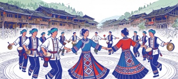 喜庆中式插画,刺绣风描绘欢庆场景,烟花映衬满月,人物舞动尽显节日氛围。