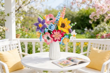 一束手工钩织的花束,主体是多朵粉色渐变的百合花,花瓣边缘颜色稍深,花蕊为黄色,搭配几朵白色的小雏菊,花茎为绿色,用白色雪梨纸和透明纱纸包裹,底部系着白色丝带蝴蝶结,一只戴着黑色和金色手链的手握着花束底部,背景是阳光明媚下的绿色树叶和湛蓝天空,整体呈现出清新自然、温馨治愈的氛围,色彩明亮柔和,光影清晰,具有手工艺术品的细腻质感和真实生活场景的生动感。