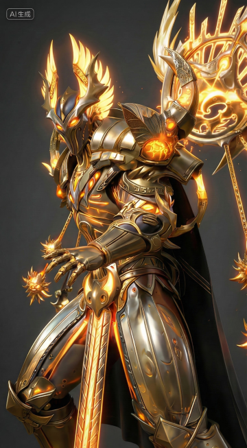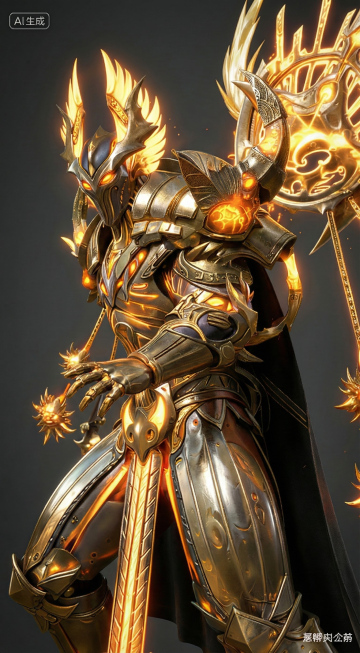 酷炫3D角色,哥特金属风盔甲,鎏金细节,神秘红光环绕,尽显威严与力量。