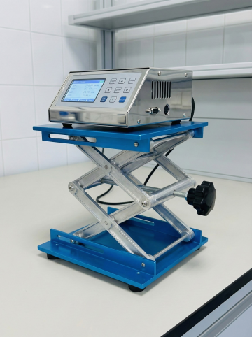 实验室环境,升降台升至120mm高度(在刻度尺155mm处有红色标记)。台面上安装着MEMS加速度传感器(黑色方形,25×25×10mm),传感器表面吸附着超薄电子水平仪(厚度仅3mm),屏幕显示“Pitch: +0.15°,Roll: -0.03°”。传感器通过柔性线缆连接到数据采集设备。工程师左手微调升降台侧方调平螺丝,眼睛注视着电脑屏幕上实时波形。一道绿色激光从侧面照射,在传感器表面形成光斑用于对准。
