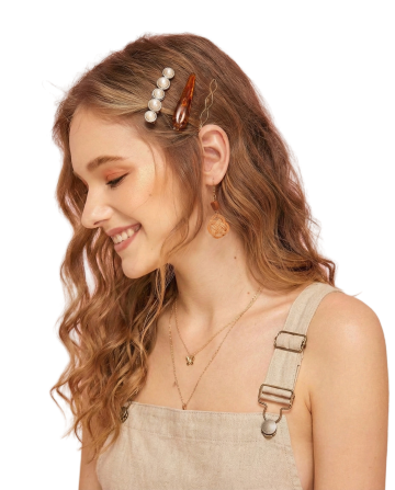 一位欧美模特正在化妆如前,正在使用图中的梳子与抓夹场景,抓夹以夹在模特头发上,模特手正拿着图中的梳子整理头发,画面整洁,光线柔和,背景纯色
