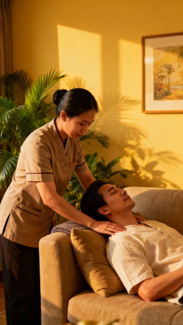 轻拟物风融合油画质感,柔和光影勾勒温馨按摩场景,实景感十足,传递舒适疗愈氛围。