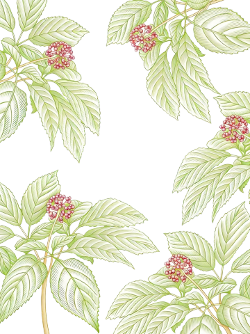 中国传统手绘插画风格,单一人参元素图案,规整排布于纯色背景上,无任何文字、logo及水印。人参主体呈自然弯曲形态,根部须状根细密舒展,表面有自然纹理,顶部带绿色羽状复叶,叶片边缘有细小锯齿,叶脉清晰,整体色彩为暖黄色根茎搭配深绿色叶片,线条流畅细腻,具有传统水墨画的韵味和植物图鉴的写实感,构图简洁平衡,突出人参的形态美感和自然属性。