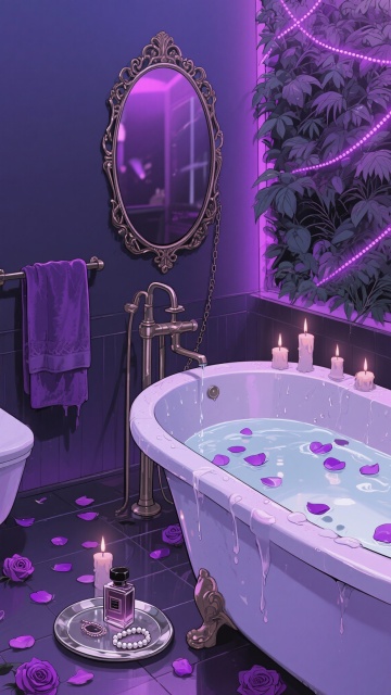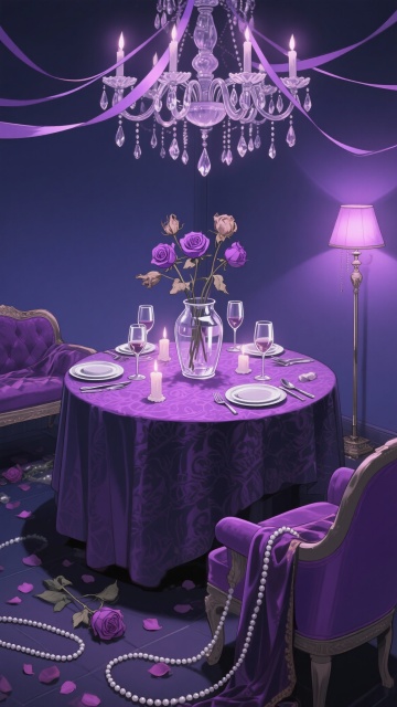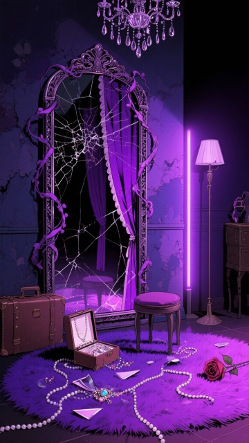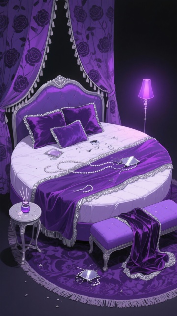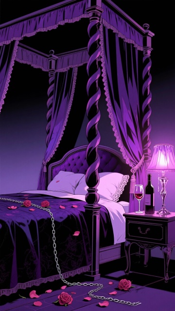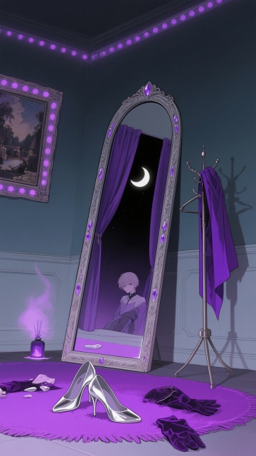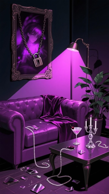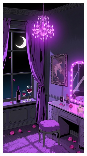 二次元,黑夜、落地镜特写,氛围性感、魅惑,暗夜紫,暗调,细节丰富,多重构体丰富,夸张构图,不要人物,超高清,生成2张