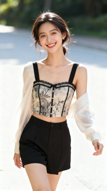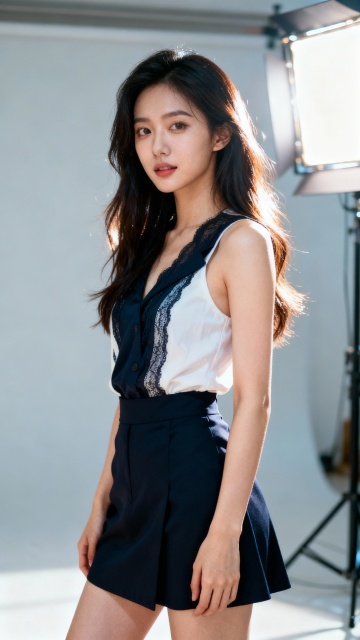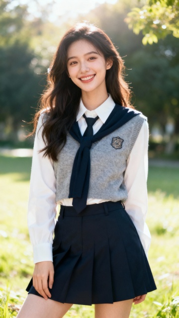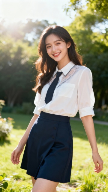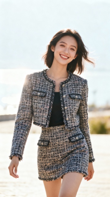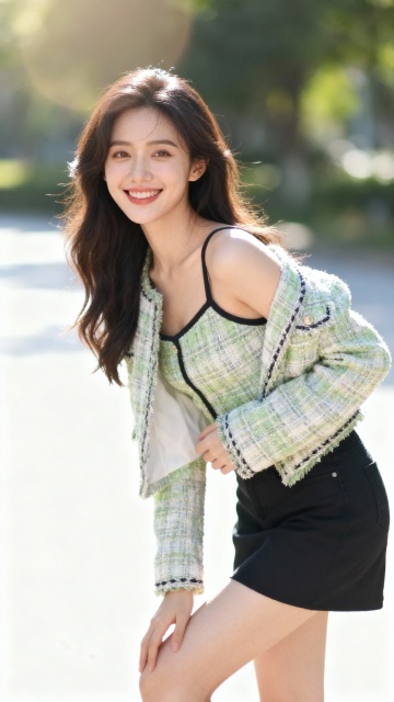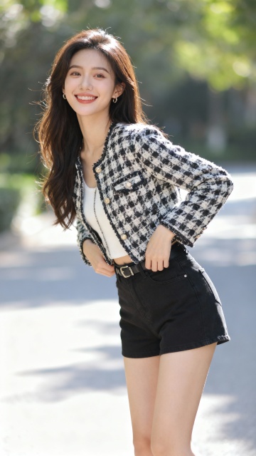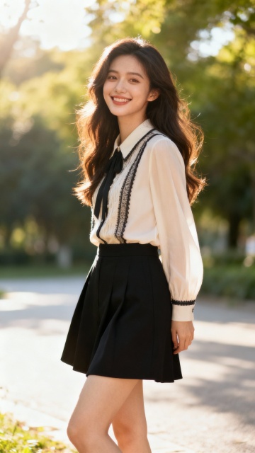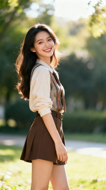 写实风格人像摄影,亚洲美女,长卷发,明亮有神的眼睛,自然微笑,白皙肌肤,穿着复古格纹背带裙搭配白色泡泡袖衬衫,站在秋日落叶纷飞的公园湖边,阳光透过树叶洒下斑驳光影,湖水呈现温暖的琥珀色调,整体氛围清新治愈,高清细腻质感,柔和自然光线,浅景深,突出主体人物。