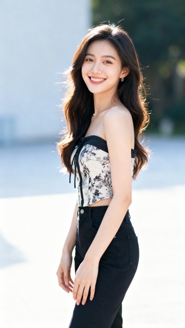 写实风格人像摄影,美女主体,棕色微卷长发,明亮有神的眼睛,自然微笑,柔和面部光影,阳光明媚的午后光线,温暖柔和的色调,波光粼粼的蓝色湖面背景,湖边木质栈道环境,穿着米色针织开衫搭配白色吊带裙,浅色系穿搭,发丝随风轻扬,清晰的皮肤质感,自然的妆容,高清晰度,浅景深,人物居中构图,宁静惬意的氛围。