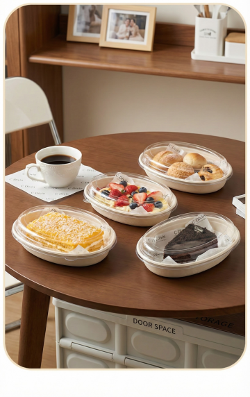 这是一张椭圆打包盒的SKU图,我想只保留这个打包盒,打包盒整体是一次性纸浆材质,盖子是透明的,换个背景:这张图呈现的是一个日常用餐场景的商品展示画面:画面中心是打包盒产品,餐盒被放置在黑色托盘上,托盘下是浅棕色木质桌面,餐盒左后方配有一只装着深色液体(似咖啡)的白色纹理陶瓷杯,杯子后方还有一个盛放着木质餐具手柄的白色容器;整体色调温馨柔和,清晰展示了餐盒的外观与使用场景。