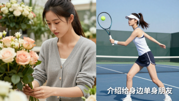 出10张图片:近景:1个20岁左右的中国女生,不同的穿着,不同的长相,不同的发型,不同的姿势,不同的环境,图片右下角添加文字:介绍给身边单身朋友