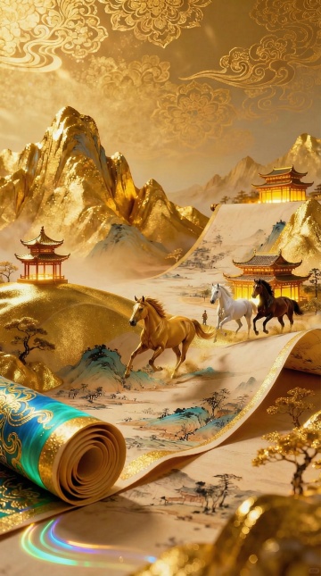 中式卷轴展开,鎏金宫殿跃然纸上,微缩艺术与浮雕风交织,红绸环绕,飞鸟掠过,尽显古典奢华与喜庆梦幻之美。
