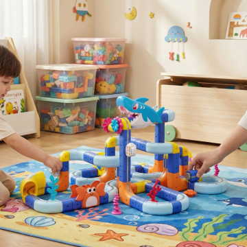 一个欧美幼儿正用手摆弄图片1的玩具;场景设定:明亮温馨的餐厅桌面光线柔和自然,风格参考:写实风格,儿童玩具商业宣传图质感,线条圆润可爱、画面清晰真实;细节补充“不要改变参考图”,人物坐在左