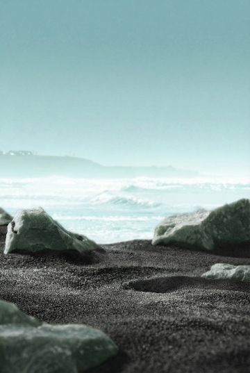 极简主义风格静物摄影,黑色背景,左上角一束柔和的聚光灯倾斜照射,照亮前景的黑色细沙地面,沙粒质感细腻且带有反光,左侧一块较大的深色岩石带有粗糙表面和少许橙色纹理,右侧一块较小的灰色岩石,整体画面营造出神秘、沉静、富有质感的氛围,光线过渡自然,阴影柔和,主体突出,构图简洁平衡。