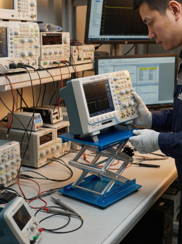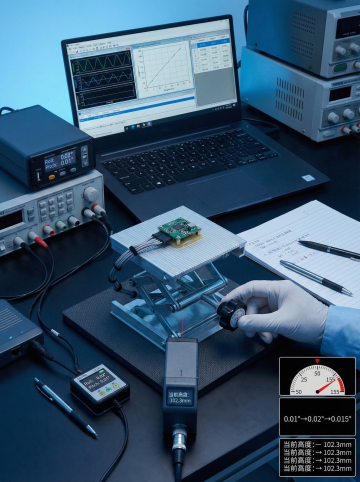 - **人物**:身穿白色实验室服的技术人员,佩戴防静电手环,正在微调升降台的侧方调平螺丝