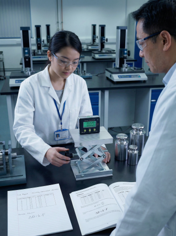 - **前景**:桌上散落着校准报告、六角扳手套装、不同厚度的不锈钢垫片