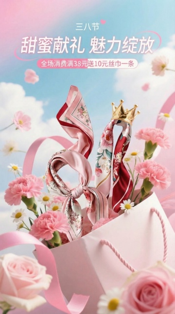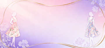 梦幻粉紫渐变背景,剪影风少女身着复古花卉裙,撕纸质感搭配金色浮雕边框,插画风呈现优雅甜蜜感。
