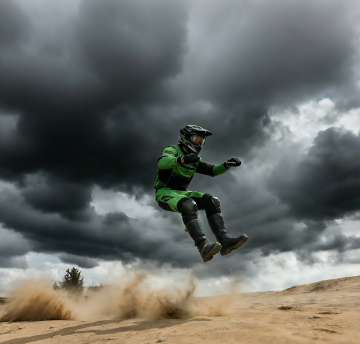 赛博朋克风夜景中,骑手疾驰于未来都市,金属质感机车与霓虹光影交织,头盔静置路面,虚实交错,科技感与酷炫感并存。