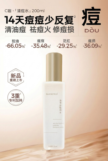 美妆产品宣传海报,整体采用清新通透的蓝白渐变色调,柔和的顶部光源营造出水润光泽感,3D立体展示的白色软管状护肤品置于圆形白色平台上,周围点缀白色花朵和绿色叶片,画面上方有产品核心功效的蓝色圆形图标与文字说明,中部包含分点介绍的肌肤问题示意图与解决方案,下方通过水滴、透明气泡等元素展现产品水润质地,搭配清晰易读的无衬线字体,整体排版层次分明,信息传达高效,符合护肤品针对敏感肌、追求温和清洁与保湿人群的宣传目的,保持相同设计风格与视觉元素,替换展示不同护肤品。