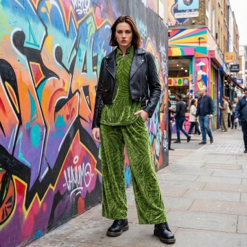 一个高级感欧美模特单膝跪姿,穿着图片上的穿搭,张扬时尚的姿势,纯色背景,(不同于图片片上模特的长相和姿势)