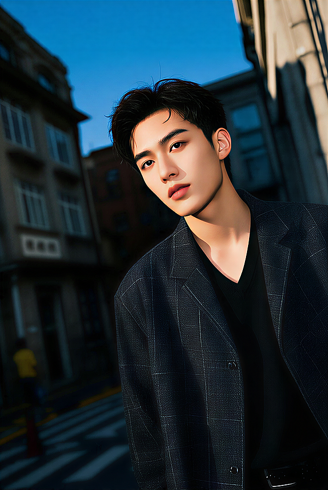 根据我提供的人物照片,帮我生成20张明星写真图,五官跟参考图片一直,照片可以都市时尚肖像,包含深色西装男性、格纹衬衫青年男性、皮夹克领带男性与侧身扶耳青年,背景涵盖纯色、天空与现代弧线元素,整体比较干净的亮色为主色调,比如白色蓝色,白黄色,暖色等呈现专业、简约且富有疏离感的时尚摄影风格。详情