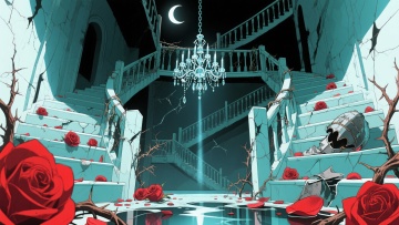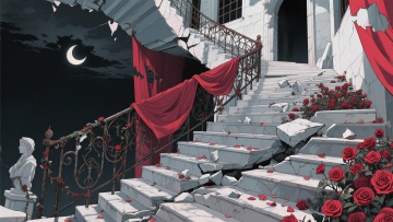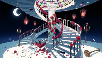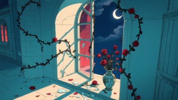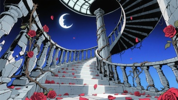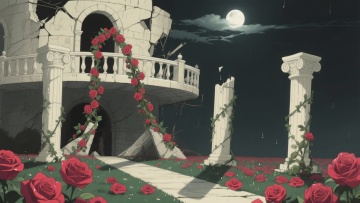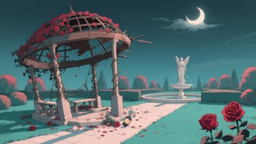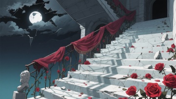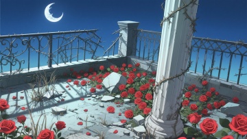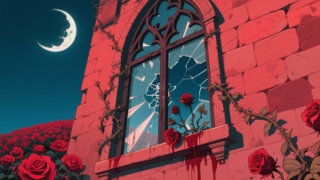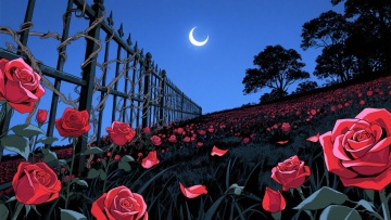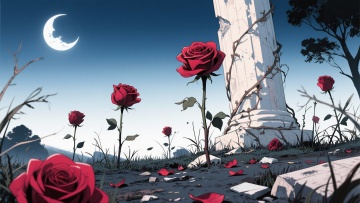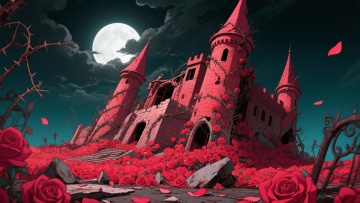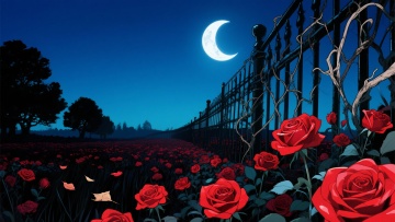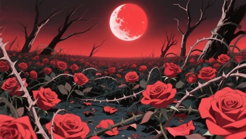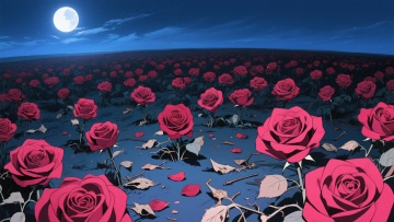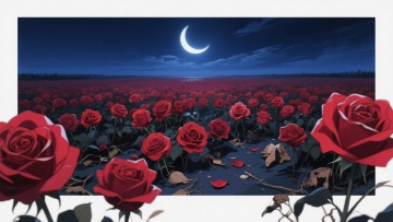二次元,黑夜、玫瑰花海、月亮,深红色,氛围压抑、孤独,细节丰富,构体丰富,夸张构图,不要人物,超高清,生成2张