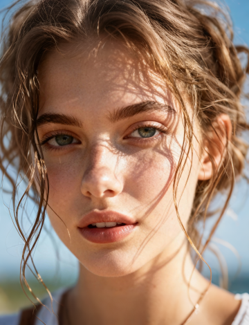 超近特写镜头,聚焦年轻女性的半张面部,细腻展现健康自然的皮肤质感,肌肤呈现出通透的米杏色基调,带有自然的浅棕色雀斑和细微的皮肤纹理,显得真实而有生命力。柔和的自然光从侧上方照射,在眼睑、颧骨和鼻梁处形成细腻的高光,光影过渡自然,立体感强。女性双眼轻闭,长而密的睫毛自然垂下,眉毛呈自然的棕色,形状柔和。唇部微张,唇色为自然的淡粉色,水润饱满。金色的发丝柔软地垂落在脸颊旁,整体氛围宁静、纯净,充满高级感。画面构图简洁,突出皮肤的自然状态和细腻质感,色调温暖柔和,光影运用精妙,展现出皮肤的健康光泽与自然肌理。
