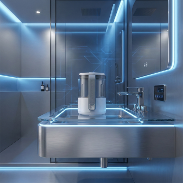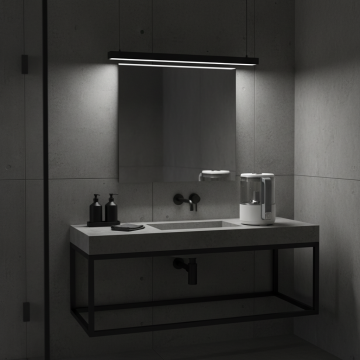 极简主义风格的卫生间室内设计,柔和的米白色与浅灰色调为主,整体明亮通透,自然光透过隐形光源均匀洒入,营造出干净、宁静、高级的氛围。浴室中央是悬挂式米白色洗手台,台面光滑整洁,台上放置简约设计的水龙头和几瓶透明瓶装洗漱用品,台下有隐藏式抽屉和开放式储物格,内置叠放整齐的毛巾与洗漱用品。洗手台上方是带LED灯带的长方形镜面柜,柜内隐约可见折叠整齐的毛巾,镜面清晰映照出浴室景象。右侧是白色壁挂式马桶,线条流畅。左侧为透明玻璃淋浴房,内部有简约的置物架和手持花洒。墙壁采用大块浅色瓷砖铺设,地面是光滑的白色大理石瓷砖,整体空间布局紧凑有序,功能分区明确。金属色毛巾架上挂着白色毛巾,与整体色调和谐统一。设计注重空间的简洁性与功能性,无多余装饰,强调材质本身的质感与光影的细腻变化,呈现出现代、简约、舒适的卫浴空间。