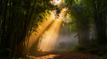 晨雾弥漫的竹林深处,一束金色的阳光如舞台追光般穿透薄雾,照亮一株斜逸而出的翠竹,竹节上凝结的露珠在光线中闪烁如碎钻,几片新抽的嫩绿竹叶低垂着触碰水面,激起一圈圈涟漪,倒影与实景在静谧的水面交织成迷离的双重世界,远处竹林层层叠叠融入朦胧的青灰色雾霭,空气中漂浮着细密的光尘,色调是清冽的翡翠绿与晨雾的柔白交织,营造出空灵而湿润的东方意境。
