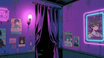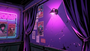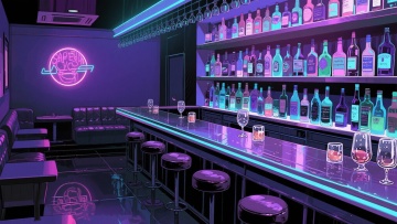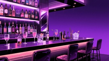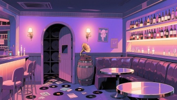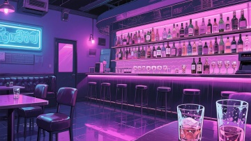 二次元日漫,酒吧、,氛围魅惑、下沉,暗紫色,细节丰富,构图夸张,不要人物,16:9,生成二张