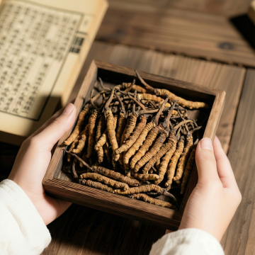 一张具有高度写实摄影风格的中药主题海报,主色调为温暖的棕黄色和土褐色,营造出古朴、自然、沉静的氛围。画面采用柔和的侧逆光,光线从左上方照射,在主体中药上形成明显的高光和细腻的阴影,增强立体感和质感。构图遵循三分法,主要物体集中在画面偏下位置,背景有浅景深的模糊处理。主体为一株完整的、形态饱满的人参,带有长长的须根,放置在一块粗糙的木质树桩切片上,树桩旁有一根横向的枯木枝干。人参旁边散落着几片切好的黄色药材薄片,一小撮干燥的绿色草药,以及一张泛黄的、上面有模糊文字的古老纸张,纸张上也放置了少量药材。背景替换为云雾缭绕的远山,山峰轮廓柔和,呈现出淡褐色调,与前景的中药元素和谐统一,整体画面质感细腻,细节丰富,光影过渡自然,传递出传统中医药的深厚底蕴与自然草本的纯净感。