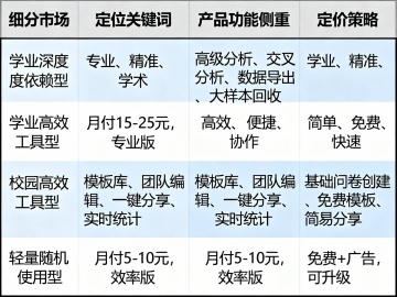 细分市场 占比 核心特征 典型用户 使用频率 付费意愿 学业深度依赖型 37.17% 功能丰富、数据精准、专业性强 大三、大四、研究生 月均 3-5 次 中高(15-25元/月) 校园高效工具型 34.29% 操作便捷、模板丰富、快速高效 学生会/社团干部、班级负责人 月均 2-3 次 中低(5-10元/月) 轻量随机使用型 28.54% 极简、免费、零学习成本 普通学生、兴趣群体 月均 <1 次 几乎为零,生成表格