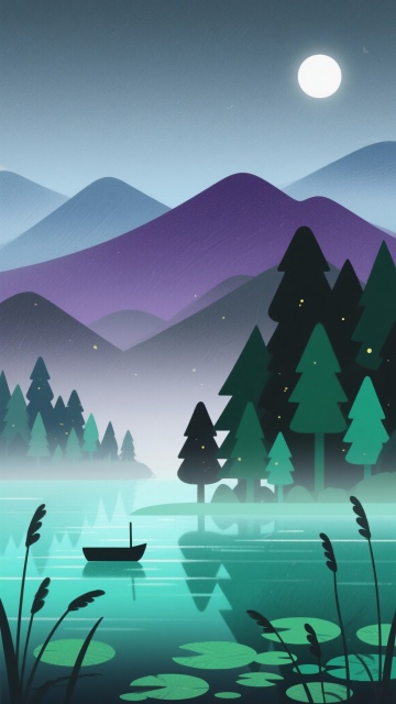 【夏季】远景镜头,青碧色的水彩幻化成厚重的绿纱笼罩画面,深绿与墨绿的梧桐叶层层叠叠,其间点缀着朱红、明黄的荷花与石榴花,露珠在叶片上滚动折射强光,阳光透过繁密枝叶形成星点光斑,色调以浓绿为底,跳跃着朱红与明黄,展现盛夏蓬勃的生命力。
