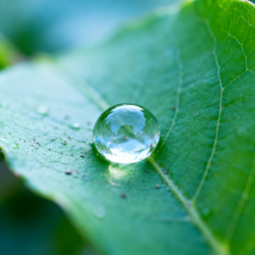 一张高清晰度的摄影作品,画面主体是一片鲜嫩的绿色荷叶,荷叶边缘自然卷曲,表面纹理清晰可见。荷叶上点缀着几颗晶莹剔透的水珠,其中一颗较大的水珠展现为半凝固的泪滴状,水珠表面光滑,折射出天空的蓝色和荷叶的绿色,边缘泛着淡淡的光晕。背景是纯净的蓝天,远处有几片模糊的荷叶轮廓,整体画面采用浅景深效果,主体荷叶和水珠清晰锐利,背景柔和虚化。光线明亮柔和,呈现出自然的日光效果,阴影细腻,色彩清新明快,营造出宁静、自然、生机勃勃的氛围。