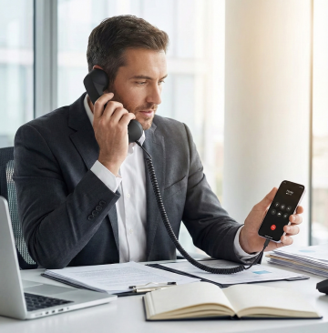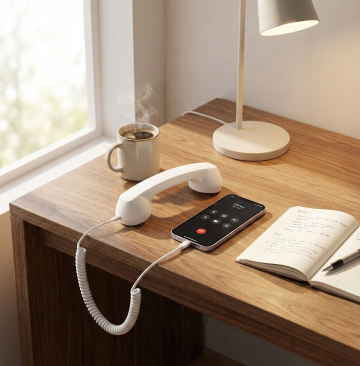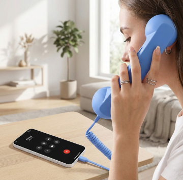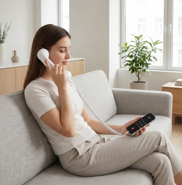 一个改变颜色的黑色固定电话的正面特写,机身和听筒为全新的纯色(非原黑色),保持光滑的塑料材质质感,银灰色的数字按键和功能按键清晰可见,屏幕为黑色显示区域,下方有品牌标识,电话线呈螺旋状自然垂下,整体采用简洁的产品静物摄影风格,光线均匀柔和,突出电话的立体轮廓和细节,纯色背景干净无杂质,无任何文字、LOGO、二维码及多余装饰元素。