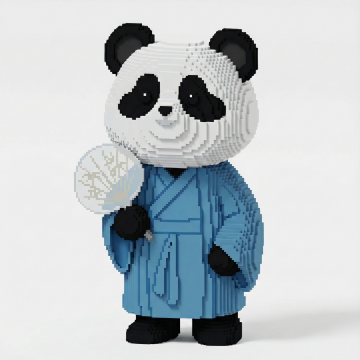 像素风熊猫拟人形象,身穿蓝色和服手持团扇,融合几何与软3D质感,展现可爱卡通感,充满东方节日氛围。
