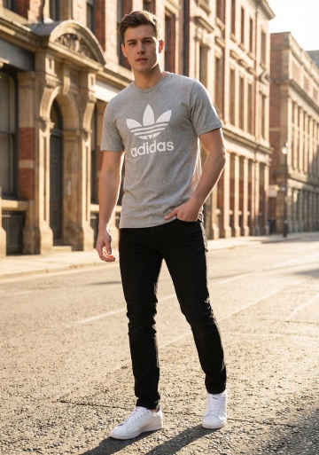 同样面貌,佩戴同款眼镜,穿着工装风格的服饰,走在繁华的街道上,街道可以略做模糊处理