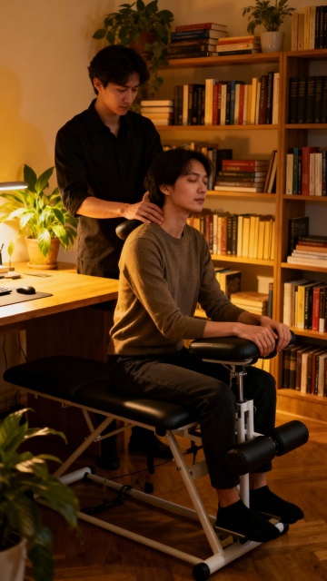 温暖柔和的自然光透过竹帘洒入,营造出宁静舒适的氛围。一位专业的按摩师正手持白色陶瓷小壶,将金黄色的按摩精油缓缓滴落在顾客的背部。顾客趴在铺着洁白毛巾的按摩床上,背部肌肤在阳光下泛着健康的光泽。背景是简约雅致的木质装饰和绿色植物,整体环境充满自然、放松的感觉,光线柔和温暖,突出精油滴落的瞬间和肌肤的质感,营造出高端SPA的舒适体验。