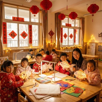 图中与非遗玲珑鱼灯,用图中产品生成场景, 场景在幼儿园,环境是新年晚上的教室,过年的氛围,小朋友和老师们在教室里DIY玲珑鱼灯,做好的鱼灯与产品保持一致,人物都用国内小孩和老师,比例1:1,生成四张