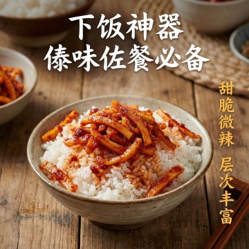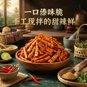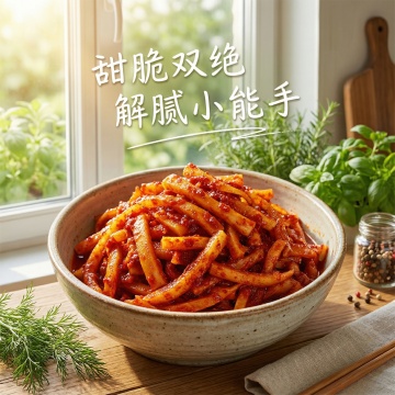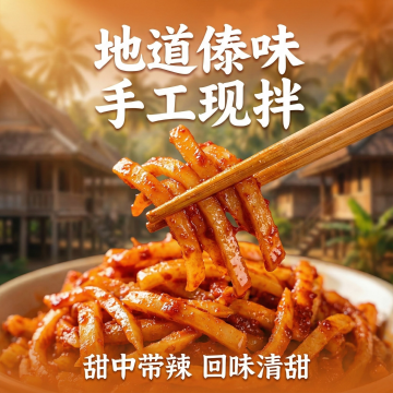 这张图片是产品主体这款产品是傣族手工现拌甜脆萝卜条 产品主体不变 我需要设计10张主图在拼多多上面售卖 进行主图场景布局设计一个高级一些主图文案内容 萝卜条口感甜脆 带有萝卜本身的清甜 同时又有傣族特色的香辣味 脆爽口感 层次丰富 开胃下饭 具有浓郁的傣族风味 食材新鲜 萝卜条口感甜脆 传承傣族传统配方 人工切条 现拌现发 甜中带微辣 辣后回甜 甜辣开胃 干饭翻倍 一口傣味脆 手工现拌的甜辣鲜 现拌锁鲜 脆甜解腻 配啥都香